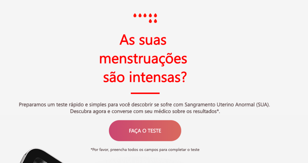 A Bayer criou um portal destinado à causa onde é possível responder um teste sobre menstruação e saber se o seu fluxo está anormal.