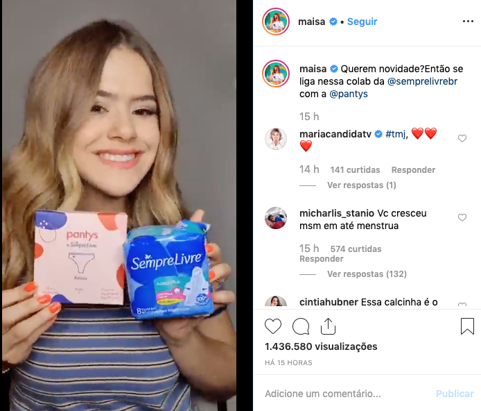Maisa é embaixadora da Sempre Livre e comentou através do IGTV a parceria de Sempre Livre (Adapt Plus) e Pantys (calcinhas absorventes).